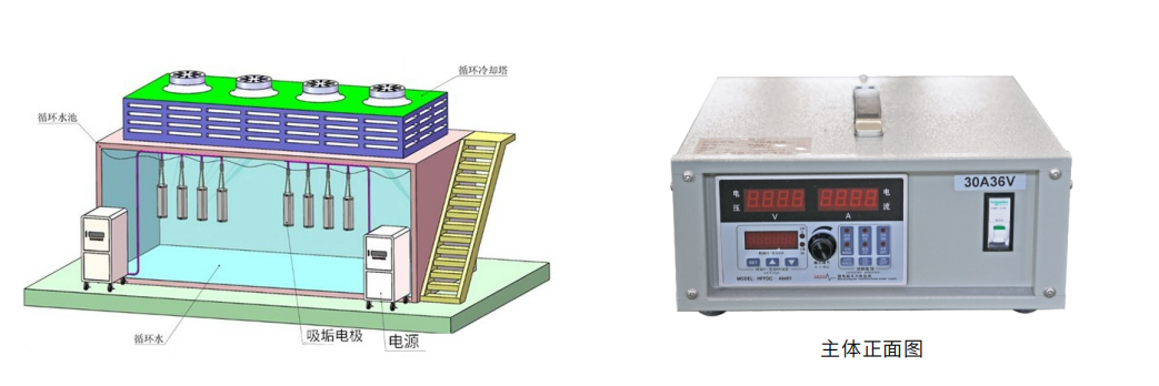 電解吸垢裝置由高頻電解電源+吸垢電極兩部份組成,它通過高頻電解方式改變水質(zhì),使循環(huán)水變成具有殺菌滅藻、除垢、除銹、防銹的小分子還原水,增強(qiáng)循環(huán)水的溶解、參透能力,并通過外網(wǎng)收集裝置易在換熱器管壁上生成的水垢轉(zhuǎn)移到收集網(wǎng)上,通過定期清理收集網(wǎng)上的水垢來達(dá)到保持換熱器管內(nèi)的潔凈、避免水垢的生成。